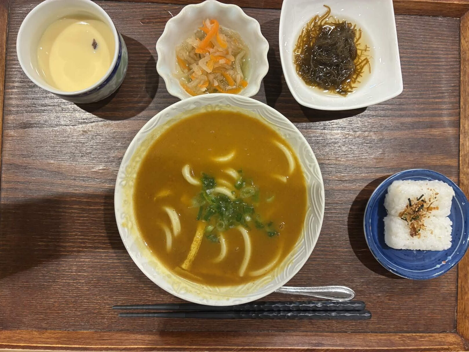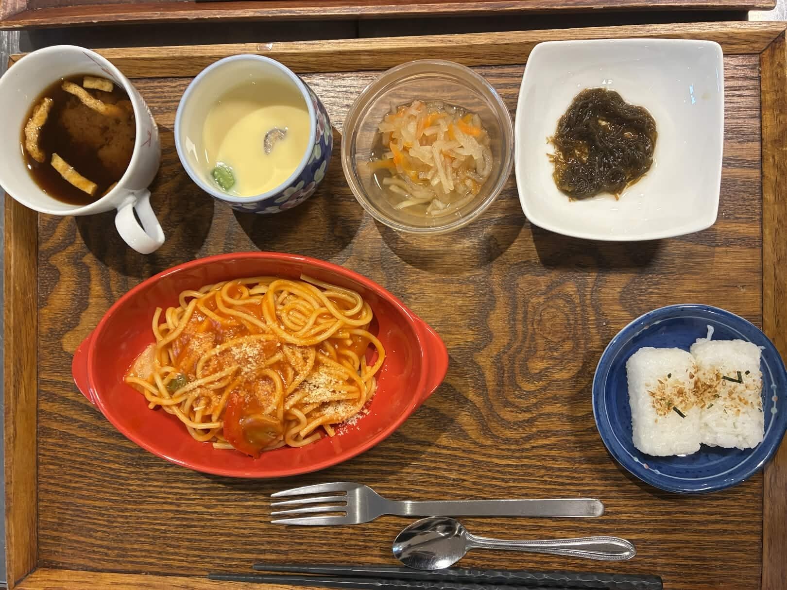 付け合わせは、おにぎり・切り干し大根の煮物・もずく酢・茶碗蒸しです。