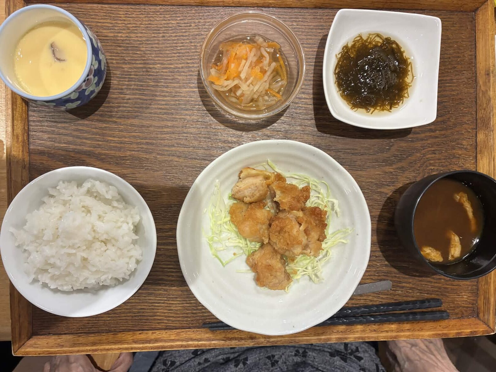 付け合わせは、ごはん・切り干し大根の煮物・もずく酢・味噌汁・茶碗蒸しです。