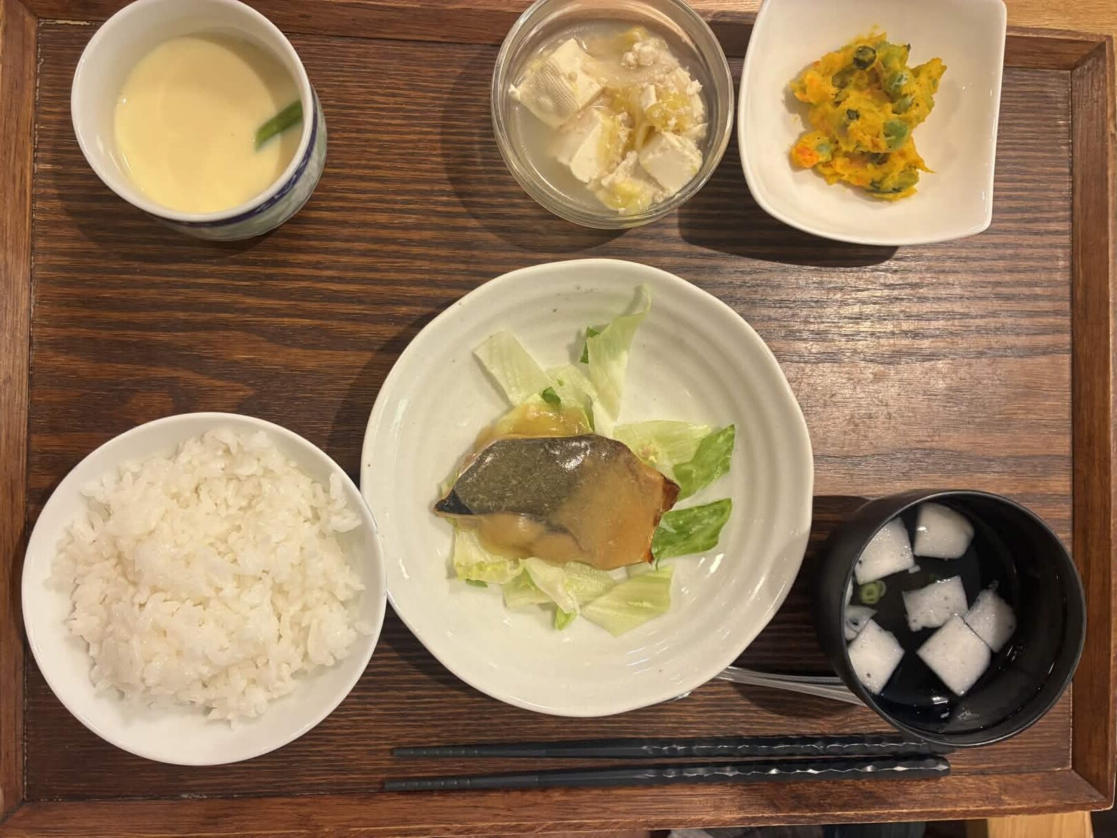 付け合わせは、ごはん・豆腐と白菜の中華あん・かぼちゃサラダ・すまし汁・茶碗蒸しです。