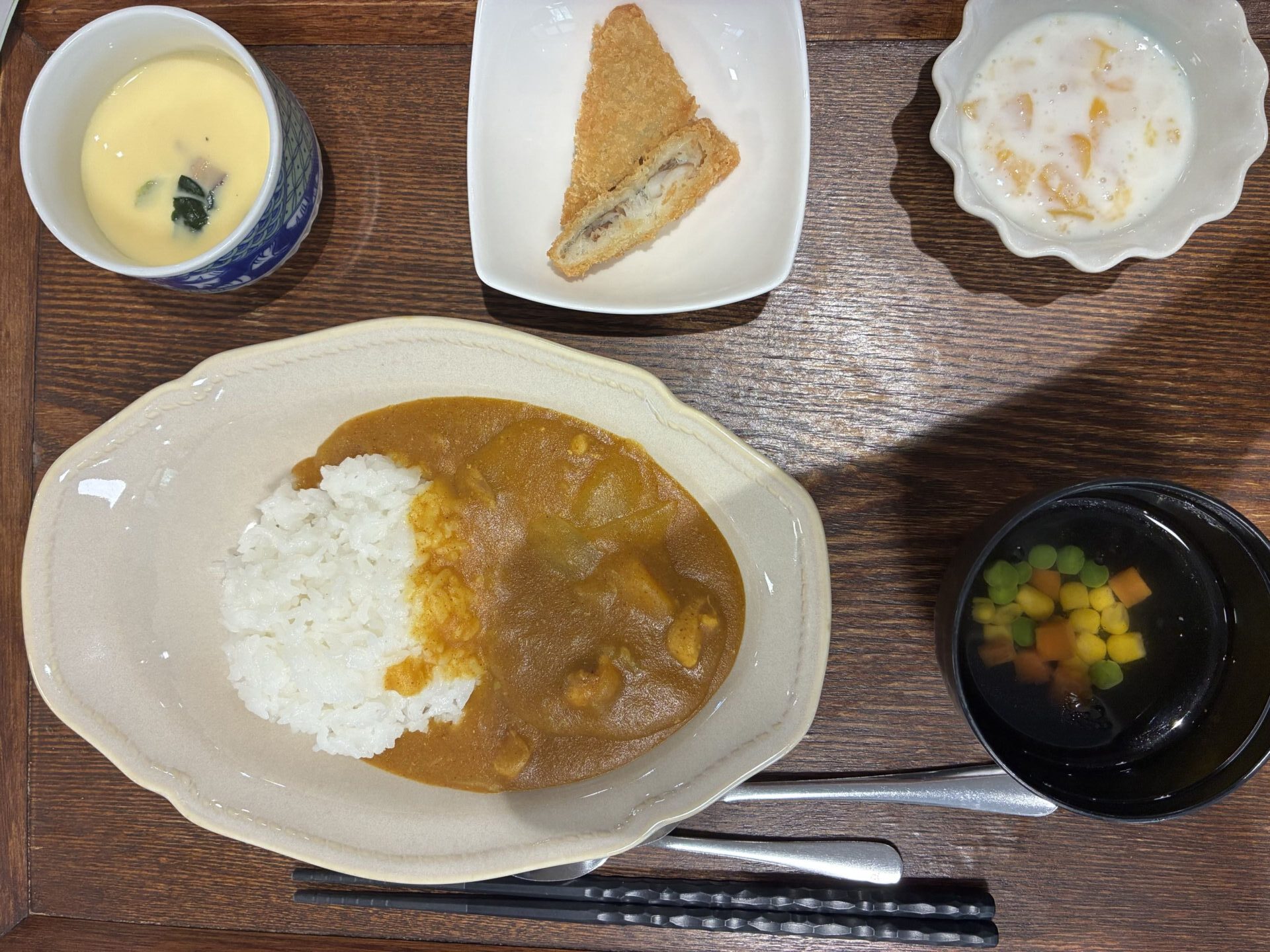 付け合わせは、ごはん・白身フライ・フルーツヨーグルト和え・コンソメスープ・茶碗蒸しです。