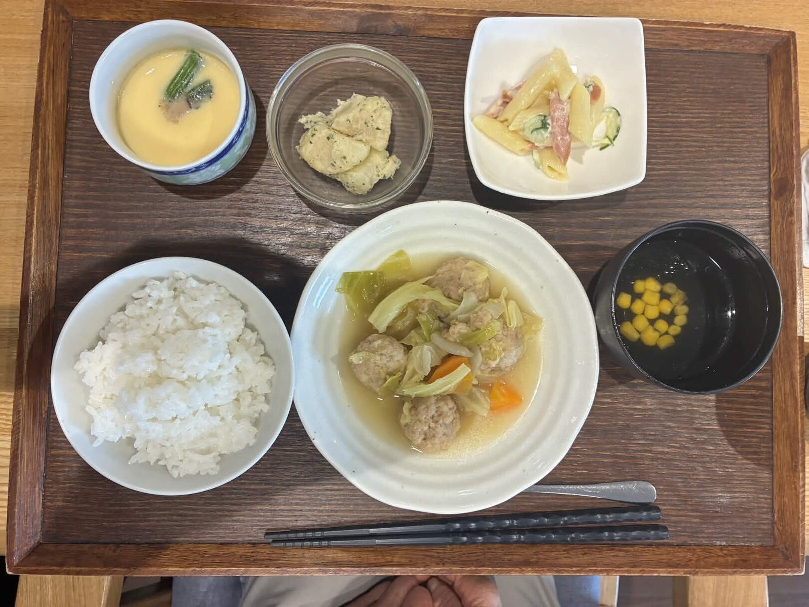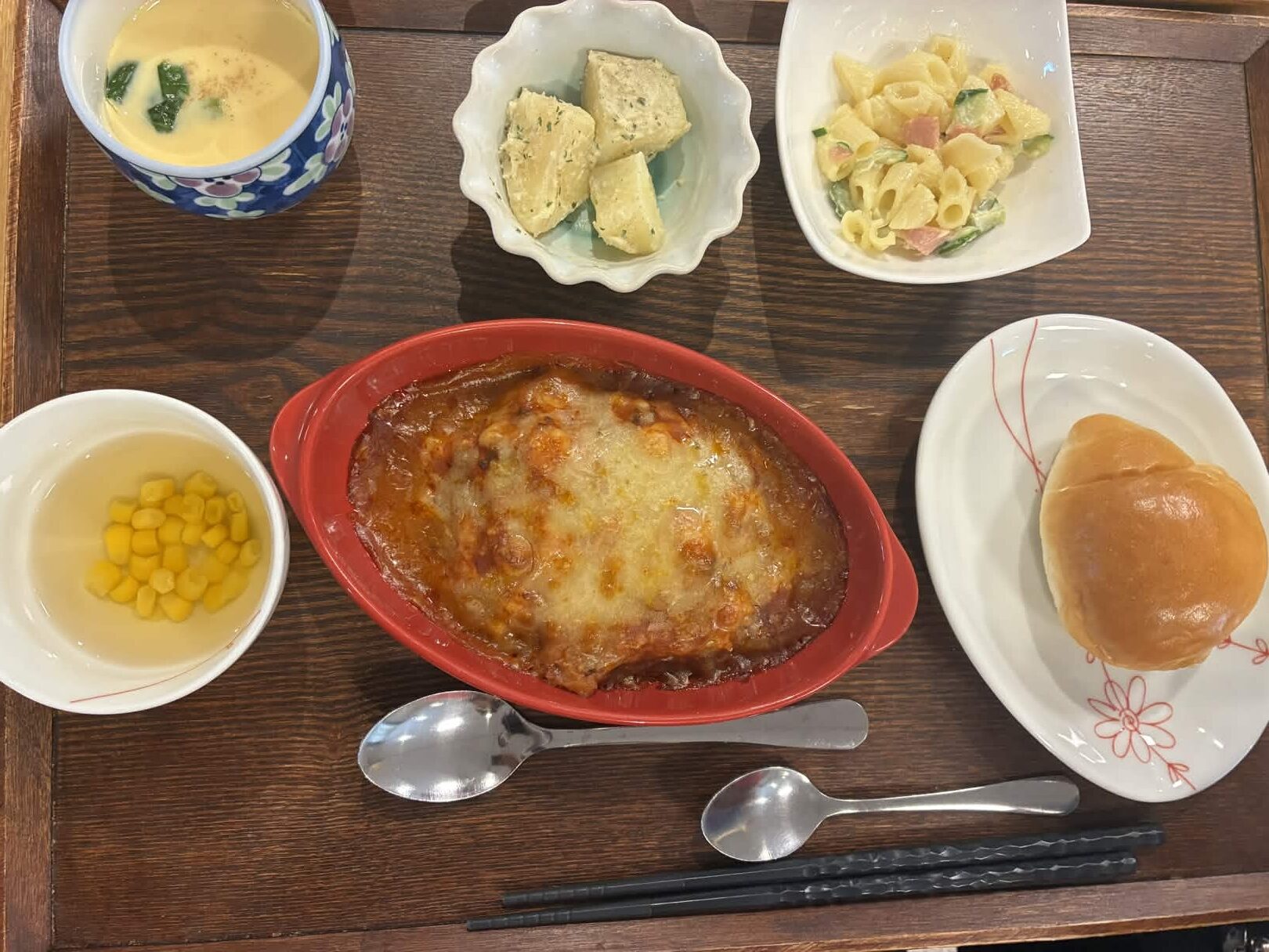 付け合わせは、ごはん・バター香る粉ふきいも・マカロニサラダ・コンソメスープ・茶碗蒸しです。