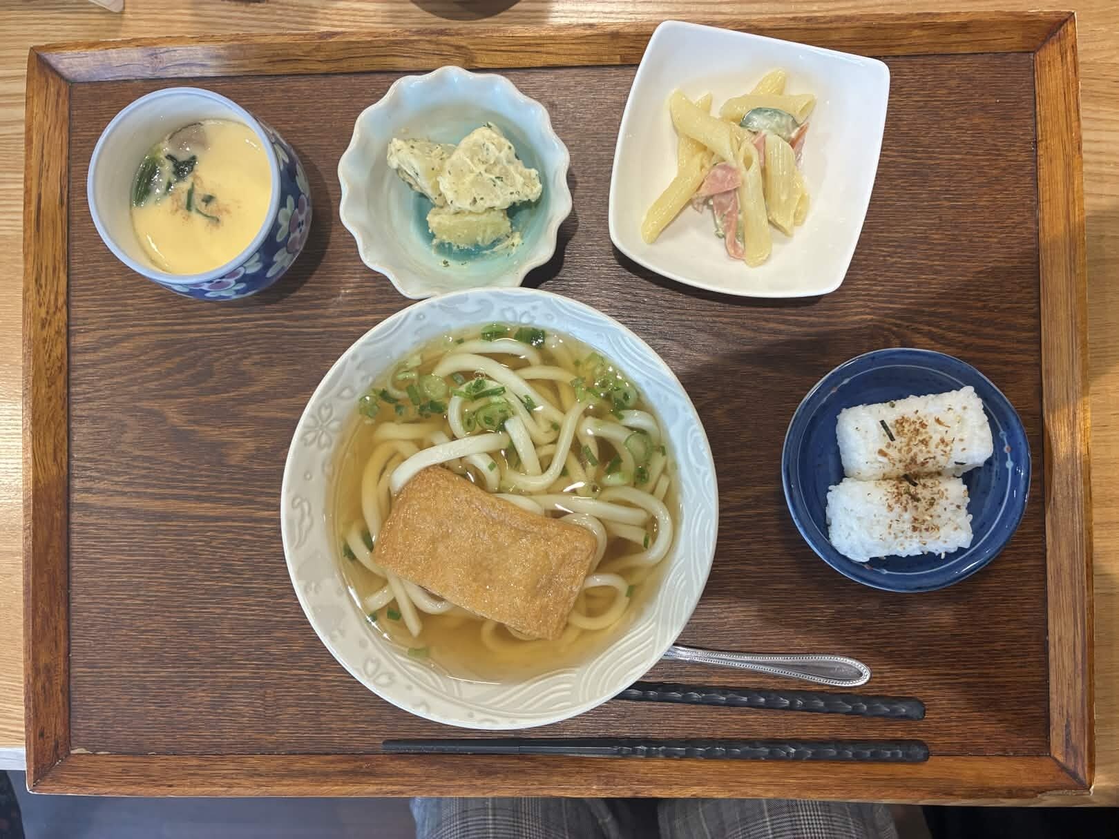 付け合わせは、おにぎり・バター香る粉ふきいも・マカロニサラダ・茶碗蒸しです。