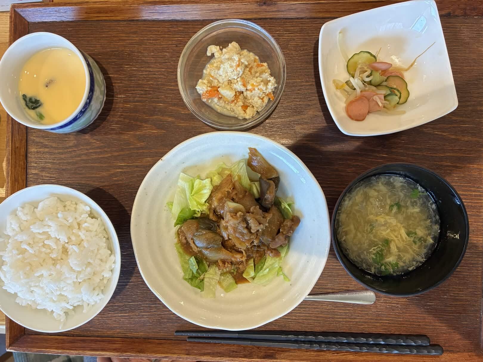 付け合わせは、ごはん・炒り豆腐・もやしの中華和え・すまし汁・茶碗蒸しです。