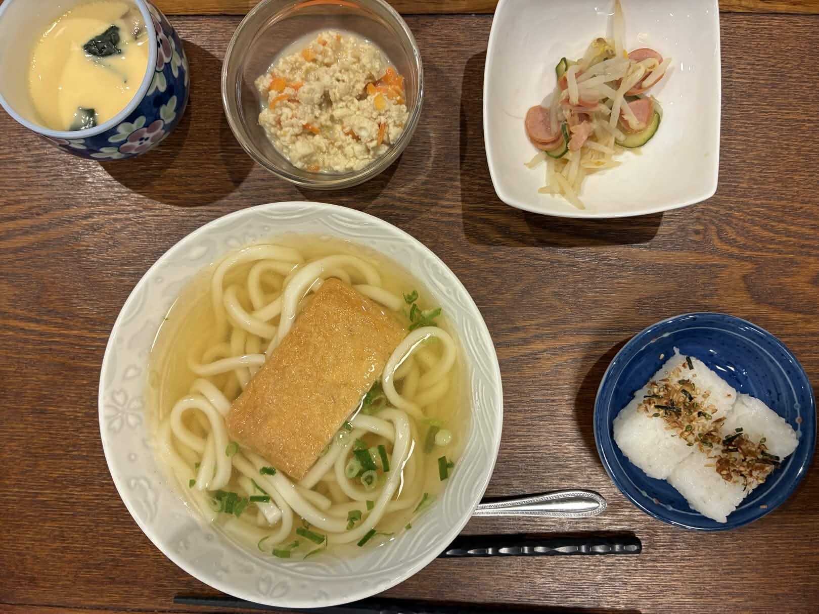 付け合わせは、おにぎり・炒り豆腐・もやしの中華和え・茶碗蒸しです。