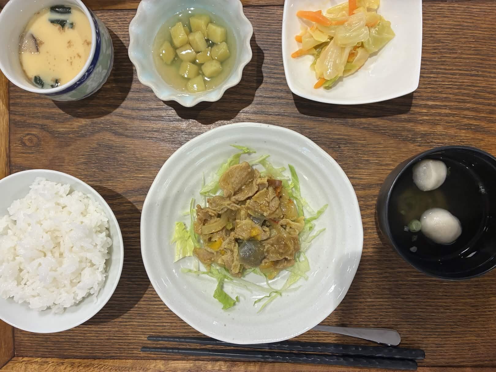 付け合わせは、ごはん・大学芋煮・コールスロー・すまし汁・茶碗蒸しです。