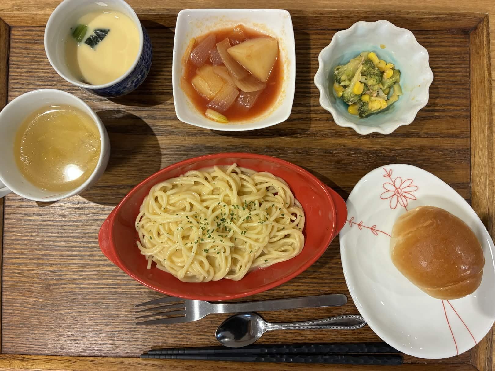 付け合わせは、ごはん・ほくほくポテトのトマト煮・ブロッコリーのサラダ・コンソメスープ・茶碗蒸しです。