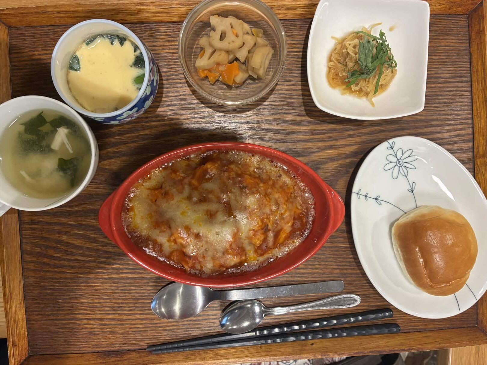 付け合わせは、ごはん・レンコン甘辛炒め・大根とじゃこのサラダ・味噌汁・茶碗蒸しです。