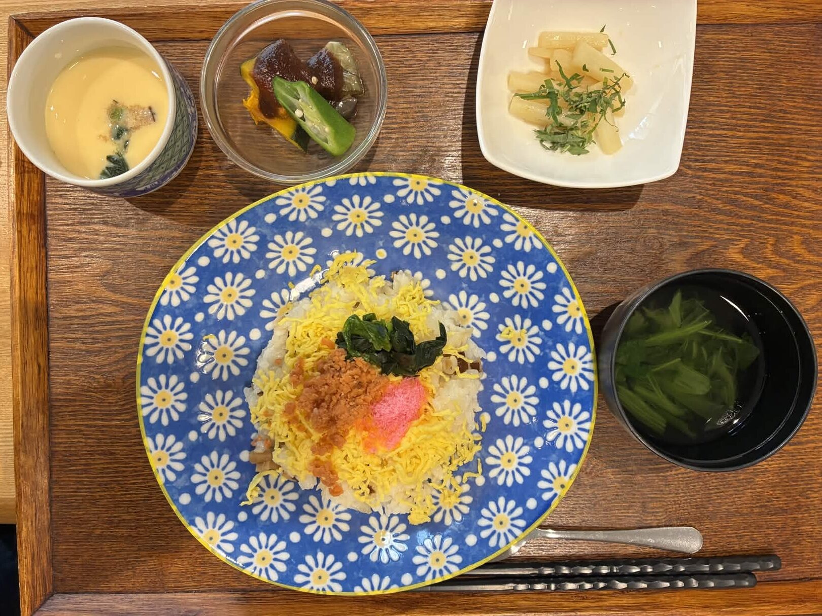 付け合わせは、ごはん・彩り野菜の胡麻味噌かけ・長芋のわさび醬油和え・すまし汁・茶碗蒸しです。