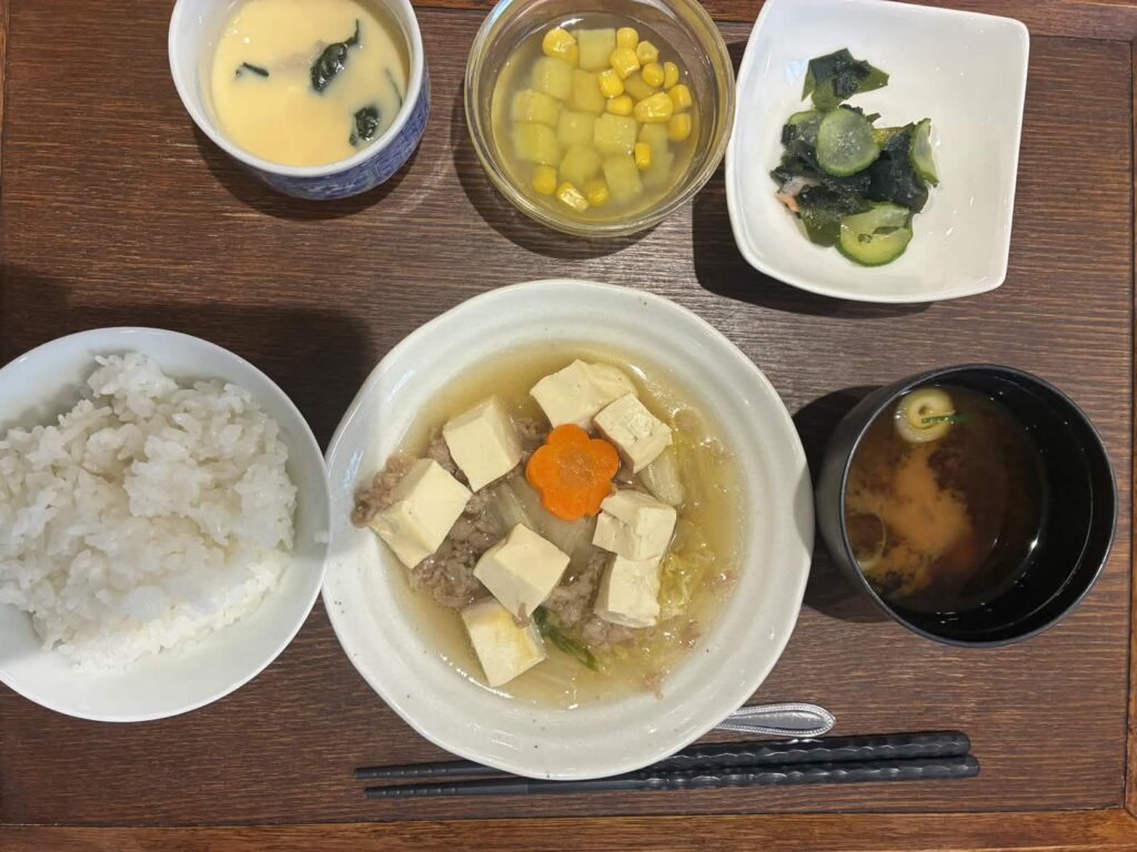 付け合わせは、ごはん・さつまいもの甘煮・胡瓜とハムの中華サラダ・味噌汁・茶碗蒸しです。