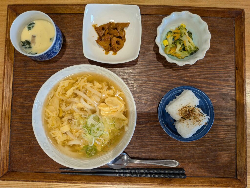 付け合わせは、レンコンの肉味噌炒め、ブロッコリーのDeli風サラダ、すまし汁、茶碗蒸しです。