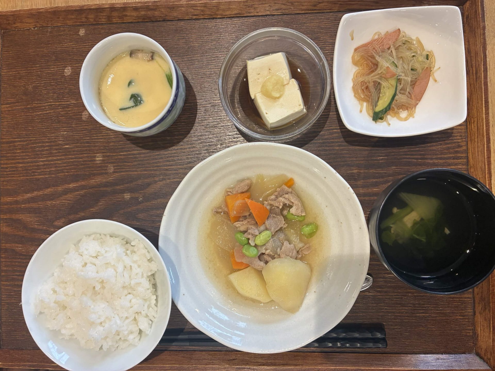 付け合わせは、ごはん・冷奴・春雨の酢の物・すまし汁・茶碗蒸しです。